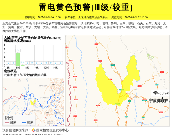 玉龙纳西族自治县气象台发布雷电黄色预警[Ⅲ级/较重] 相关文章