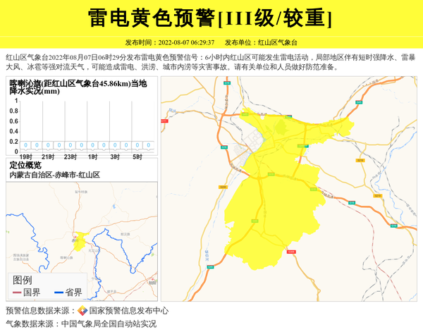 红山区气象台2022年08月07日06时29分发布雷电黄色预警信号:6小时内红山区可能发生雷电活动,局部地区伴有短时强降水、雷暴大风、冰雹等强对流天气,可能造成雷电、洪涝、城市内涝等灾害事故。请有关单位和人员做好防范准备。 信息来源:国家预警信息发布中心; 发布单位:红山区气象台。