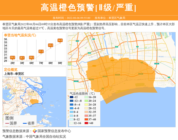 奉贤区气象局2022年08月06日09时55分发布高温橙色预警[Ⅱ级/严重]:受副热带高压影响,目前本区气温正快速上升,预计本区大部地区今天的最高气温将超过37℃,高温黄色预警信号更新为高温橙色预警信号。 信息来源:国家预警信息发布中心; 发布单位:奉贤区气象局。
