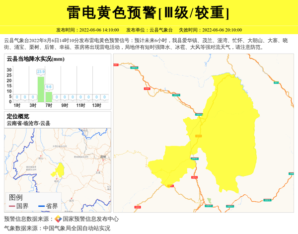 云县气象台2022年8月6日14时10分发布雷电黄色预警信号:预计未来6小时,我县爱华镇、茂兰、漫湾、忙怀、大朝山、大寨、晓街、涌宝、栗树、后箐、幸福、茶房将出现雷电活动,局地伴有短时强降水、冰雹、大风等强对流天气,请注意防范。 信息来源:国家预警信息发布中心; 发布单位:云县气象台。