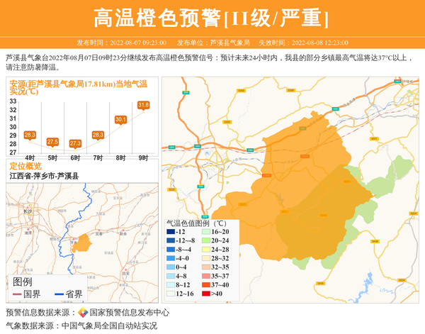 芦溪县气象台2022年08月07日09时23分继续发布高温橙色预警信号:预计未来24小时内,我县的部分乡镇最高气温将达37°C以上,请注意防暑降温。 信息来源:国家预警信息发布中心; 发布单位:芦溪县气象局。