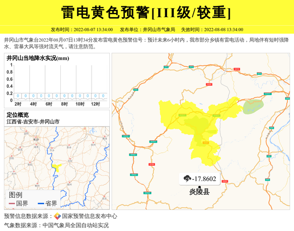 井冈山市气象台2022年08月07日13时34分发布雷电黄色预警信号:预计未来6小时内,我市部分乡镇有雷电活动,局地伴有短时强降水、雷暴大风等强对流天气,请注意防范。 信息来源:国家预警信息发布中心; 发布单位:井冈山市气象局。