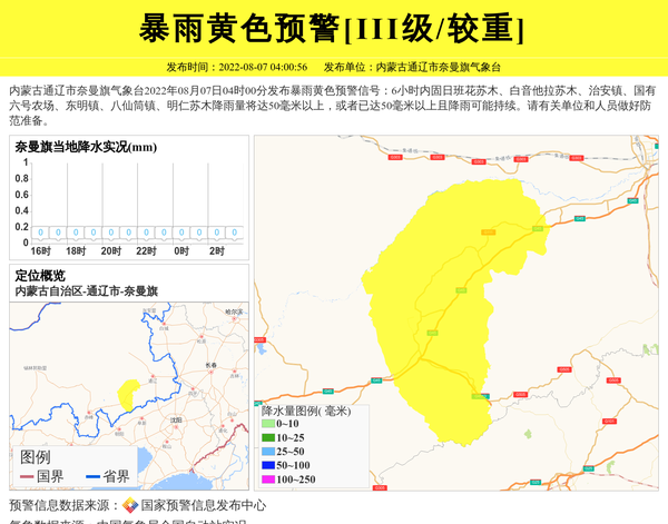 内蒙古通辽市奈曼旗气象台2022年08月07日04时00分发布暴雨黄色预警信号:6小时内固日班花苏木、白音他拉苏木、治安镇、国有六号农场、东明镇、八仙筒镇、明仁苏木降雨量将达50毫米以上,或者已达50毫米以上且降雨可能持续。请有关单位和人员做好防范准备。 信息来源:国家预警信息发布中心; 发布单位:内蒙古通辽市奈曼旗气象台。