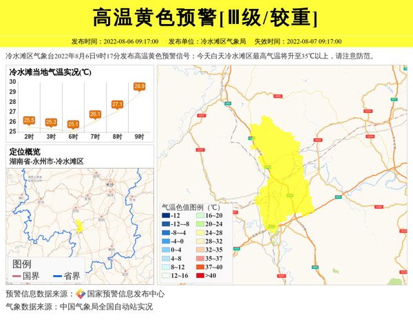 冷水滩区气象台2022年8月6日9时17分发布高温黄色预警信号:今天白天冷水滩区最高气温将升至35℃以上,请注意防范。 信息来源:国家预警信息发布中心; 发布单位:冷水滩区气象局。