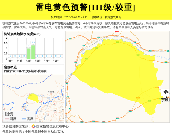 杭锦旗气象台2022年08月06日20时46分发布雷电黄色预警信号:6小时内锡尼镇、独贵塔拉镇可能发生雷电活动,局部地区伴有短时强降水、雷暴大风、冰雹等强对流天气,可能造成雷电、洪涝、城市内涝等灾害事故。请有关单位和人员做好防范准备。 信息来源:国家预警信息发布中心; 发布单位:杭锦旗气象台。