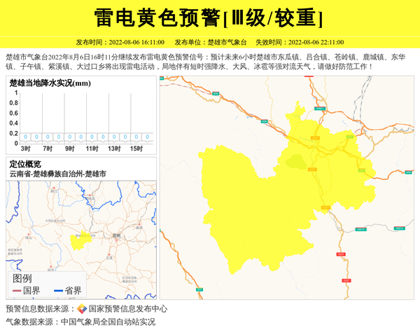 楚雄市气象台2022年8月6日16时11分继续发布雷电黄色预警信号:预计未来6小时楚雄市东瓜镇、吕合镇、苍岭镇、鹿城镇、东华镇、子午镇、紫溪镇、大过口乡将出现雷电活动,局地伴有短时强降水、大风、冰雹等强对流天气,请做好防范工作! 信息来源:国家预警信息发布中心; 发布单位:楚雄市气象台。