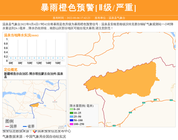 温泉县气象台2022年8月6日17时42分将暴雨蓝色升级为暴雨橙色预警信号:温泉县安格里格镇沃特克赛尔铜矿气象观测站一小时降水量达到26.1毫米,降水仍在持续,南部山区部分地区可能出现大暴雨,请注意防范! 信息来源:国家预警信息发布中心; 发布单位:温泉县气象台。