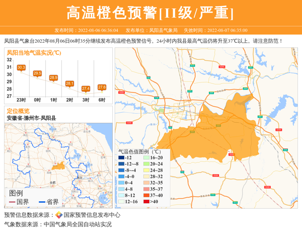 凤阳县气象台2022年08月06日06时35分继续发布高温橙色预警信号。24小时内我县最高气温仍将升至37℃以上。请注意防范! 信息来源:国家预警信息发布中心; 发布单位:凤阳县气象局。