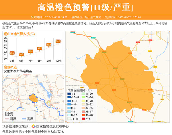 砀山县气象台2022年08月06日10时53分继续发布高温橙色预警信号。我县大部分乡镇24小时内最高气温将升至37℃以上,局部地区超过39℃。请注意防范! 信息来源:国家预警信息发布中心; 发布单位:砀山县气象局。
