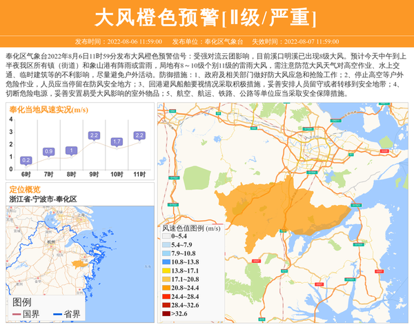 奉化区气象台2022年8月6日11时59分发布大风橙色预警信号:受强对流云团影响,目前溪口明溪已出现8级大风。预计今天中午到上半夜我区所有镇(街道)和象山港有阵雨或雷雨,局地有8~10级个别11级的雷雨大风,需注意防范大风天气对高空作业、水上交通、临时建筑等的不利影响,尽量避免户外活动。防御措施:1、政府及相关部门做好防大风应急和抢险工作;2、停止高空等户外危险作业,人员应当停留在防风安全地方;3、回港避风船舶要视情况采取积极措施,妥善安排人员留守或者转移到安全地带;4、切断危险电源,妥善安置易受大风影响的室外物品;5、航空、航运、铁路、公路等单位应当采取安全保障措施。 信息来源:国家预警信息发布中心; 发布单位:奉化区气象台。
