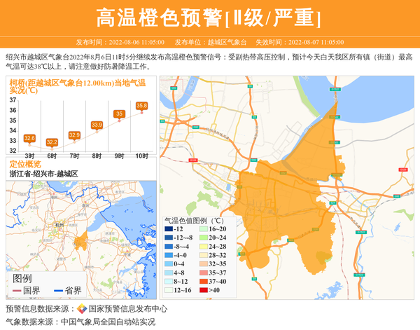 绍兴市越城区气象台2022年8月6日11时5分继续发布高温橙色预警信号:受副热带高压控制,预计今天白天我区所有镇(街道)最高气温可达38℃以上,请注意做好防暑降温工作。 信息来源:国家预警信息发布中心; 发布单位:越城区气象台。