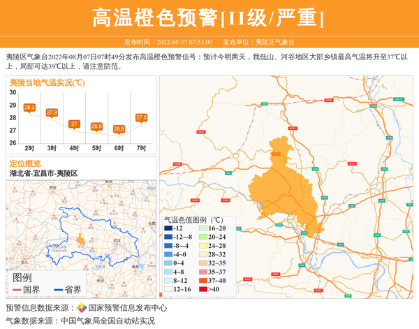 夷陵区气象台2022年08月07日07时49分发布高温橙色预警信号:预计今明两天,我低山、河谷地区大部乡镇最高气温将升至37℃以上,局部可达39℃以上,请注意防范。 信息来源:国家预警信息发布中心; 发布单位:夷陵区气象台。