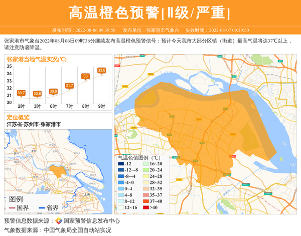 张家港市气象台2022年08月06日09时36分继续发布高温橙色预警信号:预计今天我市大部分区镇(街道)最高气温将达37℃以上,请注意防暑降温。 信息来源:国家预警信息发布中心; 发布单位:张家港市气象台。