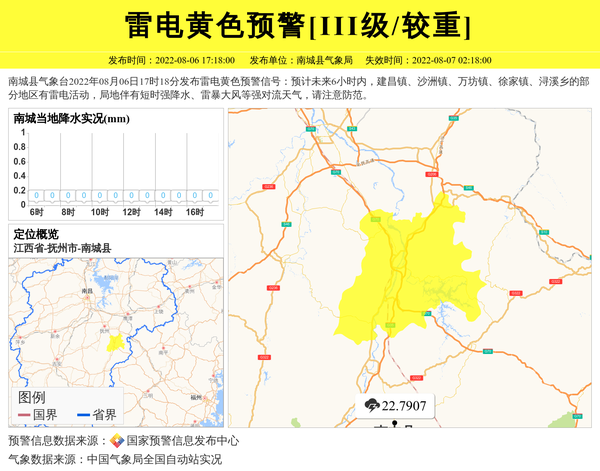 南城县气象台2022年08月06日17时18分发布雷电黄色预警信号:预计未来6小时内,建昌镇、沙洲镇、万坊镇、徐家镇、浔溪乡的部分地区有雷电活动,局地伴有短时强降水、雷暴大风等强对流天气,请注意防范。 信息来源:国家预警信息发布中心; 发布单位:南城县气象局。