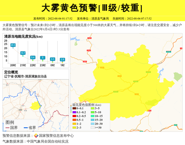 大雾黄色预警信号:预计未来1到2小时,清原县将出现能见度小于500米的大雾天气,并将持续3到4小时,请注意交通安全,减少户外活动。清原县气象台2022年8月6日1时13分发布 信息来源:国家预警信息发布中心; 发布单位:清原县气象局。