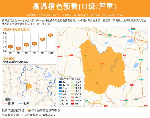 霍邱县气象台2022年08月06日11时07分继续发布高温橙色预警信号。24小时内我县临水镇、夏店镇、高塘镇、龙潭镇等乡镇及周边地区最高气温将升至37℃以上。请注意防范! 信息来源:国家预警信息发布中心; 发布单位:霍邱县气象局。