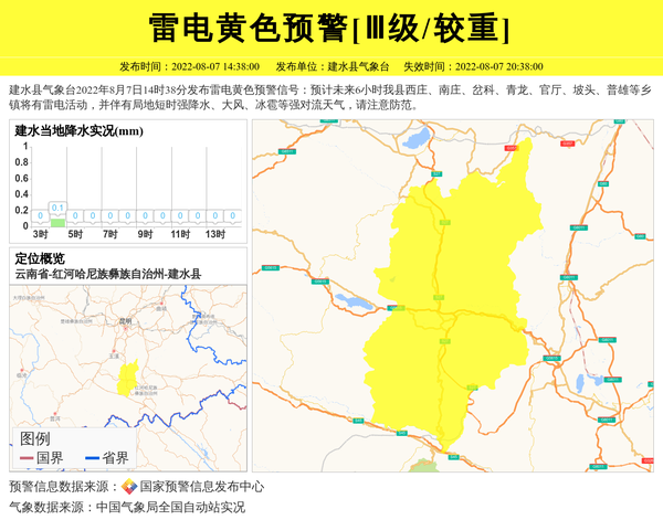 建水县气象台2022年8月7日14时38分发布雷电黄色预警信号:预计未来6小时我县西庄、南庄、岔科、青龙、官厅、坡头、普雄等乡镇将有雷电活动,并伴有局地短时强降水、大风、冰雹等强对流天气,请注意防范。 信息来源:国家预警信息发布中心; 发布单位:建水县气象台。