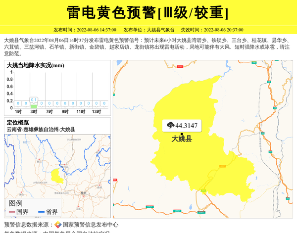 大姚县气象台2022年08月06日14时37分发布雷电黄色预警信号:预计未来6小时大姚县湾碧乡、铁锁乡、三台乡、桂花镇、昙华乡、六苴镇、三岔河镇、石羊镇、新街镇、金碧镇、赵家店镇、龙街镇将出现雷电活动,局地可能伴有大风、短时强降水或冰雹,请注意防范。 信息来源:国家预警信息发布中心; 发布单位:大姚县气象台。