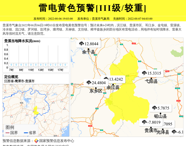 贵溪市气象台2022年08月06日19时03分发布雷电黄色预警信号:预计未来6小时内,滨江镇、贵溪市区、耳口乡、金屯镇、雷溪镇、冷水镇、流口镇、罗河镇、彭湾乡、塘湾镇、天禄镇、文坊镇、樟坪畲族乡的部分地区有雷电活动,局地伴有短时强降水、雷暴大风等强对流天气,请注意防范。 信息来源:国家预警信息发布中心; 发布单位:贵溪市气象局。