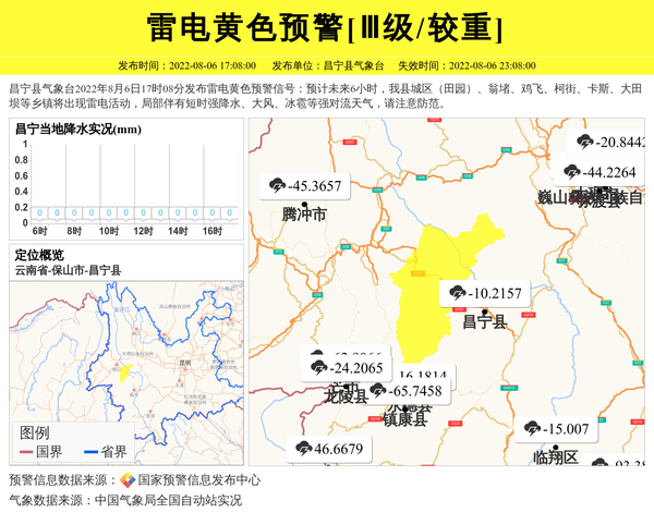 昌宁县气象台2022年8月6日17时08分发布雷电黄色预警信号:预计未来6小时,我县城区(田园)、翁堵、鸡飞、柯街、卡斯、大田坝等乡镇将出现雷电活动,局部伴有短时强降水、大风、冰雹等强对流天气,请注意防范。 信息来源:国家预警信息发布中心; 发布单位:昌宁县气象台。