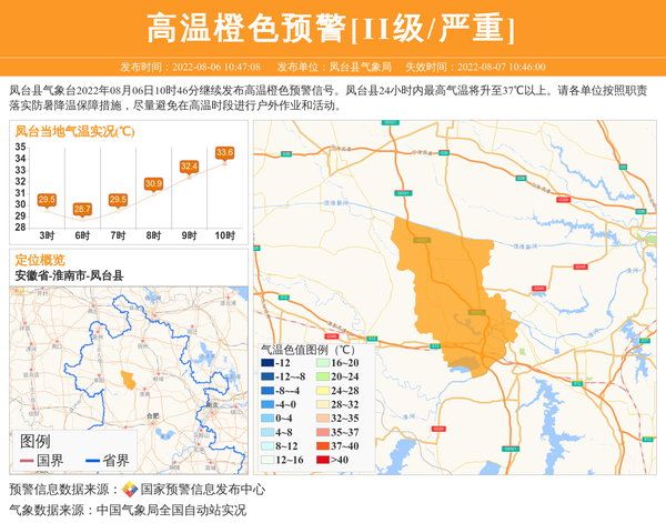 凤台县气象台2022年08月06日10时46分继续发布高温橙色预警信号。凤台县24小时内最高气温将升至37℃以上。请各单位按照职责落实防暑降温保障措施,尽量避免在高温时段进行户外作业和活动。 信息来源:国家预警信息发布中心; 发布单位:凤台县气象局。