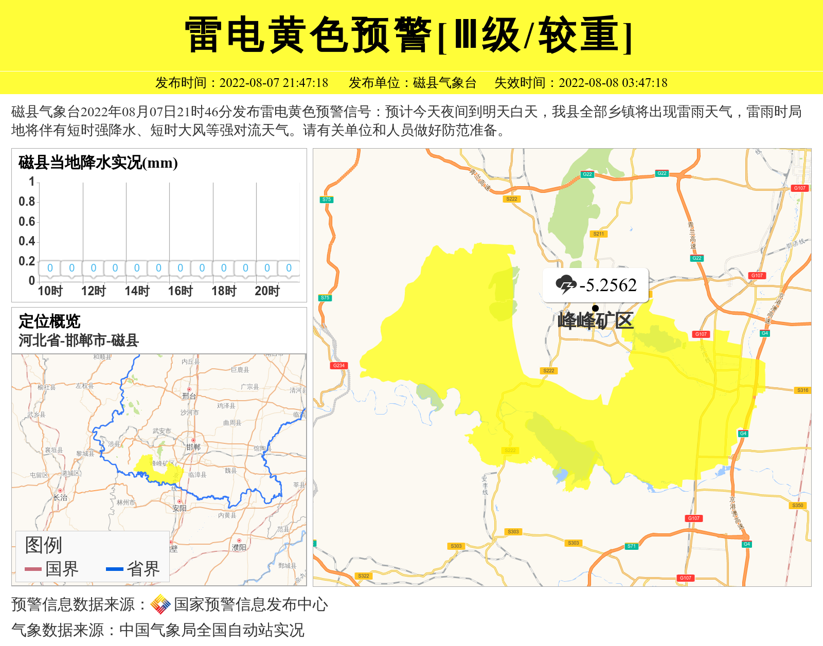 磁县气象台2022年08月07日21时46分发布雷电黄色预警信号:预计今天夜间到明天白天,我县全部乡镇将出现雷雨天气,雷雨时局地将伴有短时强降水、短时大风等强对流天气。请有关单位和人员做好防范准备。 信息来源:国家预警信息发布中心; 发布单位:磁县气象台。