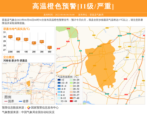 获嘉县气象台2022年08月06日06时56分发布高温橙色预警信号:预计今天白天,我县全部乡镇最高气温将达37℃以上,请注意防暑降温并采取保障措施。 信息来源:国家预警信息发布中心; 发布单位:获嘉县气象局。