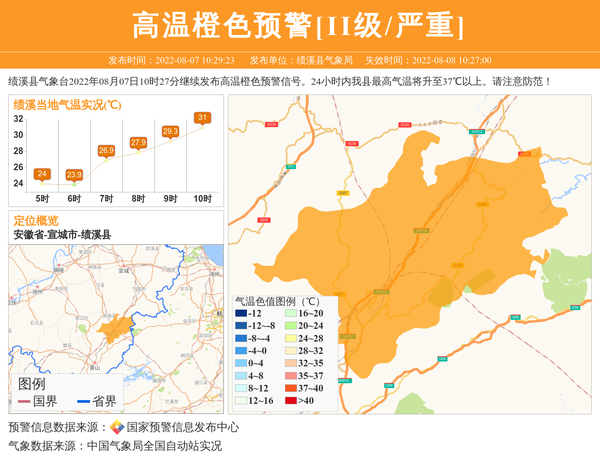 绩溪县气象台2022年08月07日10时27分继续发布高温橙色预警信号。24小时内我县最高气温将升至37℃以上。请注意防范! 信息来源:国家预警信息发布中心; 发布单位:绩溪县气象局。