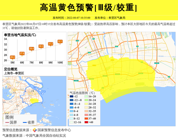 奉贤区气象局2022年08月07日10时35分发布高温黄色预警[Ⅲ级/较重]:受副热带高压影响,预计本区大部地区今天的最高气温将超过35℃,请做好防暑降温工作。 信息来源:国家预警信息发布中心; 发布单位:奉贤区气象局。