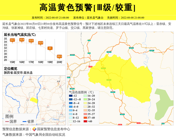 延长县气象台2022年08月05日21时08分发布高温黄色预警信号:预计下述地区未来连续三天日最高气温将在35℃以上:雷赤镇、安沟镇、张家滩镇、郑庄镇、七里村街道、罗子山镇、交口镇、黑家堡镇,请注意防范。 信息来源:国家预警信息发布中心; 发布单位:延长县气象台。