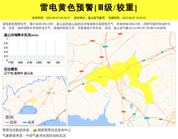 雷电黄色预警信号:预计未来1到2小时,盘山县和盘山县的沿岸海域将出现雷电天气,并将持续3到4小时,同时可能伴有短时大风、冰雹、短时强降水等强对流天气,请做好防雷工作,尽量避免户外作业、活动。盘山县气象台2022年8月7日4时36分发布 信息来源:国家预警信息发布中心; 发布单位:盘山县气象局。