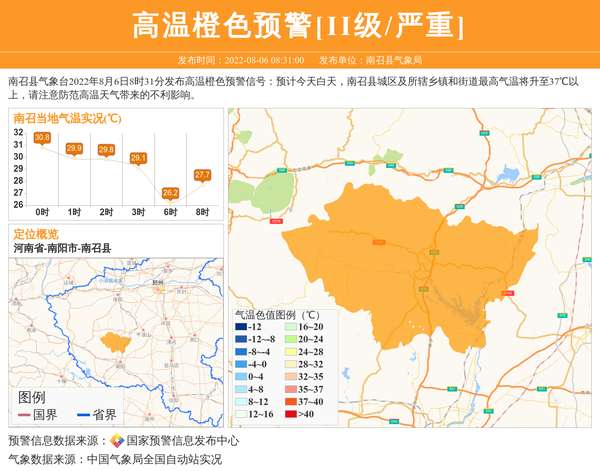 南召县气象台2022年8月6日8时31分发布高温橙色预警信号:预计今天白天,南召县城区及所辖乡镇和街道最高气温将升至37℃以上,请注意防范高温天气带来的不利影响。 信息来源:国家预警信息发布中心; 发布单位:南召县气象局。