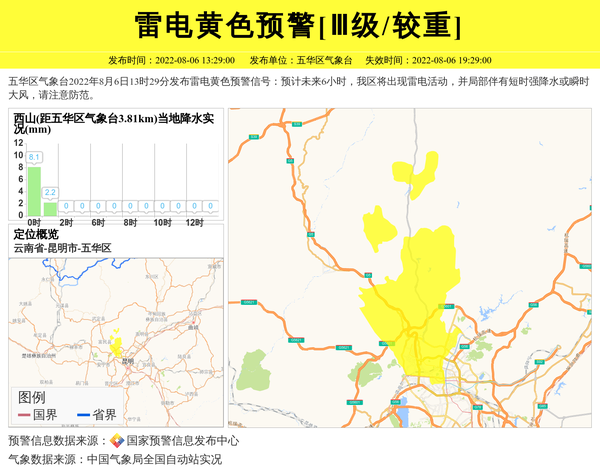 五华区气象台2022年8月6日13时29分发布雷电黄色预警信号:预计未来6小时,我区将出现雷电活动,并局部伴有短时强降水或瞬时大风,请注意防范。 信息来源:国家预警信息发布中心; 发布单位:五华区气象台。
