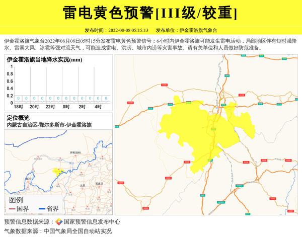 伊金霍洛旗气象台2022年08月08日05时15分发布雷电黄色预警信号:6小时内伊金霍洛旗可能发生雷电活动,局部地区伴有短时强降水、雷暴大风、冰雹等强对流天气,可能造成雷电、洪涝、城市内涝等灾害事故。请有关单位和人员做好防范准备。 信息来源:国家预警信息发布中心; 发布单位:伊金霍洛旗气象台。