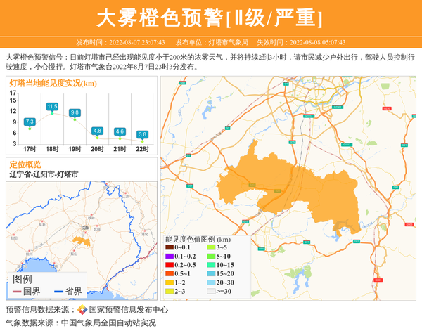 大雾橙色预警信号:目前灯塔市已经出现能见度小于200米的浓雾天气,并将持续2到3小时,请市民减少户外出行,驾驶人员控制行驶速度,小心慢行。灯塔市气象台2022年8月7日23时3分发布。 信息来源:国家预警信息发布中心; 发布单位:灯塔市气象局。