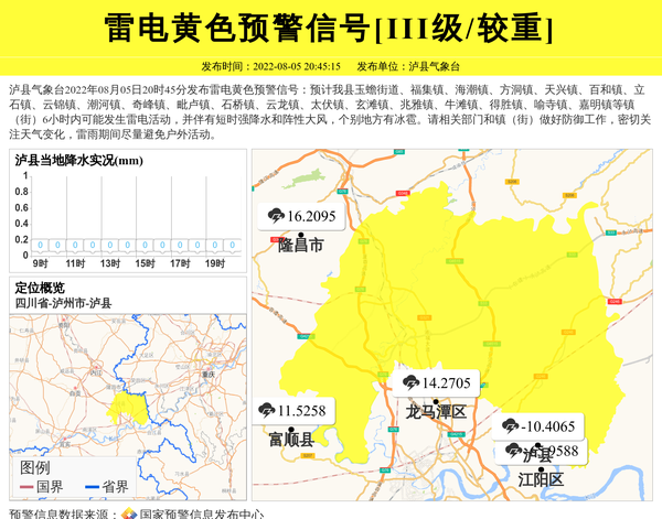 泸县气象台2022年08月05日20时45分发布雷电黄色预警信号:预计我县玉蟾街道、福集镇、海潮镇、方洞镇、天兴镇、百和镇、立石镇、云锦镇、潮河镇、奇峰镇、毗卢镇、石桥镇、云龙镇、太伏镇、玄滩镇、兆雅镇、牛滩镇、得胜镇、喻寺镇、嘉明镇等镇(街)6小时内可能发生雷电活动,并伴有短时强降水和阵性大风,个别地方有冰雹。请相关部门和镇(街)做好防御工作,密切关注天气变化,雷雨期间尽量避免户外活动。 信息来源:国家预警信息发布中心; 发布单位:泸县气象台。