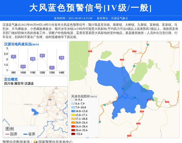 汉源县气象台2022年08月09日14时53分发布大风蓝色预警信号:预计我县安乐镇、唐家镇、大树镇、九襄镇、富林镇、富泉镇、马烈乡、片马彝族乡、小堡藏族彝族乡、顺河乡等乡镇24小时内可能受大风影响,平均风力可达6级以上或者阵风7级以上。请政府及有关部门做好防御大风的准备工作,切断户外危险电源,妥善安置易受大风影响的室外物品,遮盖建筑物资;人员外出注意行路、行车安全,刮风时不要在广告牌、临时搭建物等下面逗留。 信息来源:国家预警信息发布中心; 发布单位:汉源县气象台。