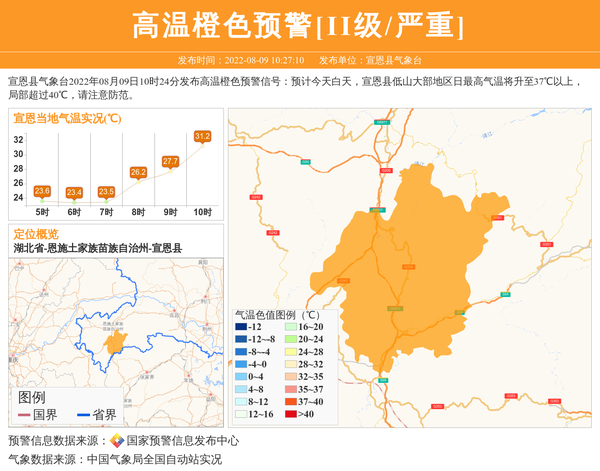 宣恩县气象台2022年08月09日10时24分发布高温橙色预警信号:预计今天白天,宣恩县低山大部地区日最高气温将升至37℃以上,局部超过40℃,请注意防范。 信息来源:国家预警信息发布中心; 发布单位:宣恩县气象台。
