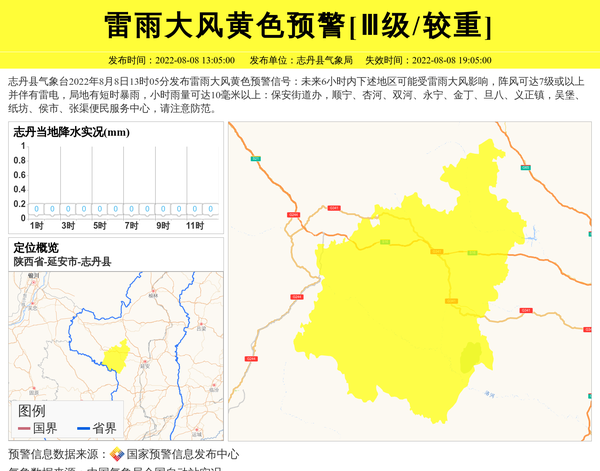 志丹县气象台2022年8月8日13时05分发布雷雨大风黄色预警信号:未来6小时内下述地区可能受雷雨大风影响,阵风可达7级或以上并伴有雷电,局地有短时暴雨,小时雨量可达10毫米以上:保安街道办,顺宁、杏河、双河、永宁、金丁、旦八、义正镇,吴堡、纸坊、侯市、张渠便民服务中心,请注意防范。 信息来源:国家预警信息发布中心; 发布单位:志丹县气象局。