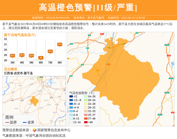 新干县气象台2022年08月09日09时05分继续发布高温橙色预警信号:预计未来24小时内,新干县大部分乡镇日最高气温将达37°C以上,请注意防暑降温,家长朋友请注意看管好小孩,谨防溺水。 信息来源:国家预警信息发布中心; 发布单位:新干县气象局。