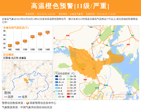 永修县气象台2022年08月08日14时42分发布高温橙色预警信号:预计未来24小时我县日最高气温将达37℃以上,请注意做好防暑降温工作! 信息来源:国家预警信息发布中心; 发布单位:永修县气象局。