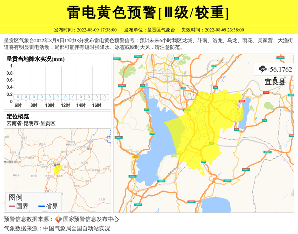 呈贡区气象台2022年8月9日17时38分发布雷电黄色预警信号:预计未来6小时我区龙城、斗南、洛龙、乌龙、雨花、吴家营、大渔街道将有明显雷电活动,局部可能伴有短时强降水、冰雹或瞬时大风,请注意防范。 信息来源:国家预警信息发布中心; 发布单位:呈贡区气象台。