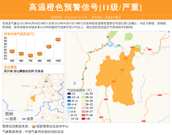 甘洛县气象台2022年08月08日10时31分对2022年08月07日14时52分发布的高温橙色预警信号进行第1次确认:乌史大桥镇、苏雄镇、田坝镇、新市坝镇等乡镇未来24小时内最高气温将升至38℃以上。请注意防范高温天气带来的不利影响。 信息来源:国家预警信息发布中心; 发布单位:甘洛县气象台。