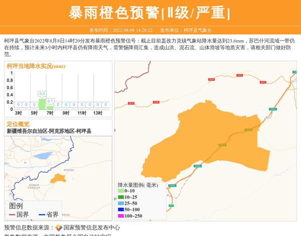 柯坪县气象台2022年8月8日14时20分发布暴雨橙色预警信号:截止目前盖孜力克镇气象站降水量达到23.6mm,苏巴什河流域一带仍在持续,预计未来3小时内柯坪县仍有降雨天气,需警惕降雨汇集,造成山洪、泥石流、山体滑坡等地质灾害,请相关部门做好防范。 信息来源:国家预警信息发布中心; 发布单位:柯坪县气象台。