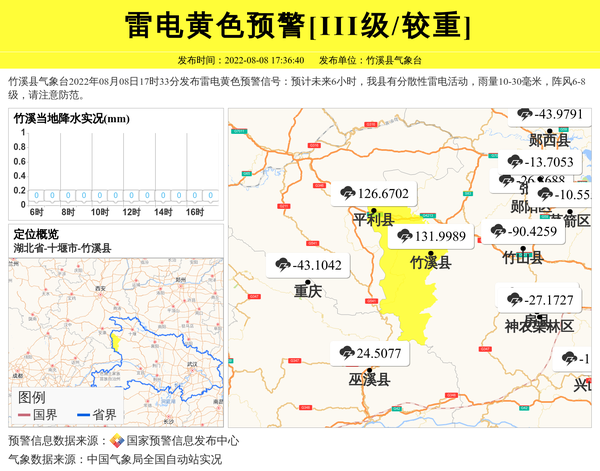竹溪县气象台2022年08月08日17时33分发布雷电黄色预警信号:预计未来6小时,我县有分散性雷电活动,雨量10-30毫米,阵风6-8级,请注意防范。 信息来源:国家预警信息发布中心; 发布单位:竹溪县气象台。