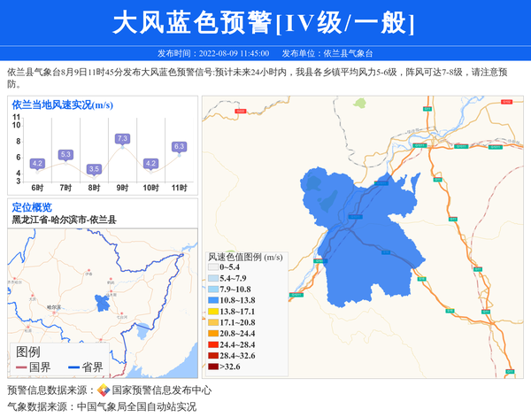 依兰县气象台8月9日11时45分发布大风蓝色预警信号:预计未来24小时内,我县各乡镇平均风力5-6级,阵风可达7-8级,请注意预防。 信息来源:国家预警信息发布中心; 发布单位:依兰县气象台。