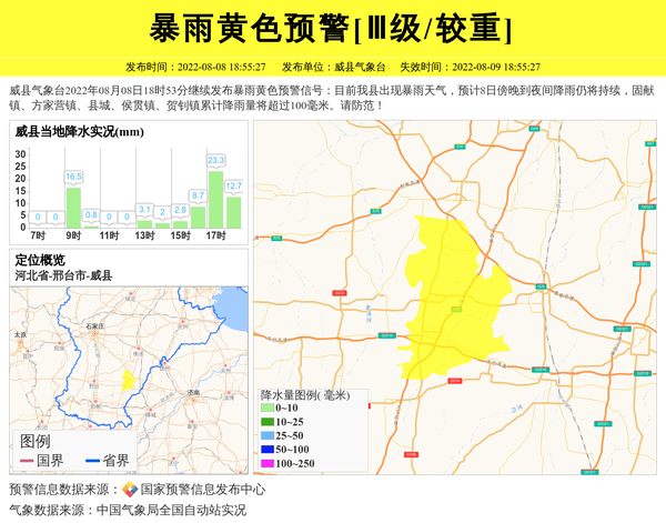 威县气象台2022年08月08日18时53分继续发布暴雨黄色预警信号:目前我县出现暴雨天气,预计8日傍晚到夜间降雨仍将持续,固献镇、方家营镇、县城、侯贯镇、贺钊镇累计降雨量将超过100毫米。请防范! 信息来源:国家预警信息发布中心; 发布单位:威县气象台。