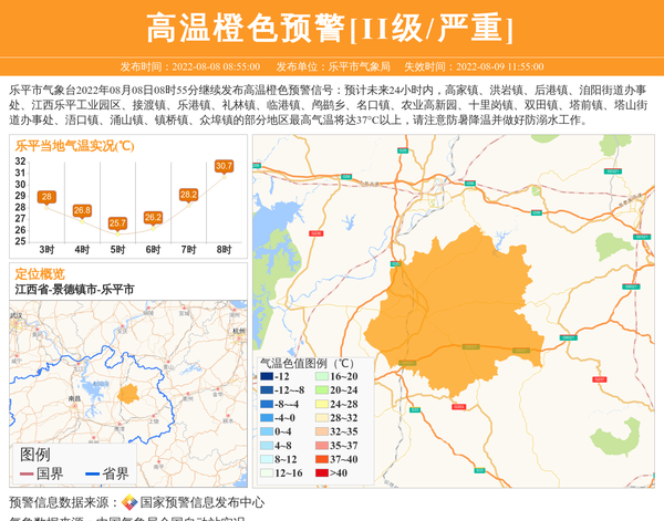 乐平市气象台2022年08月08日08时55分继续发布高温橙色预警信号:预计未来24小时内,高家镇、洪岩镇、后港镇、洎阳街道办事处、江西乐平工业园区、接渡镇、乐港镇、礼林镇、临港镇、鸬鹚乡、名口镇、农业高新园、十里岗镇、双田镇、塔前镇、塔山街道办事处、浯口镇、涌山镇、镇桥镇、众埠镇的部分地区最高气温将达37°C以上,请注意防暑降温并做好防溺水工作。 信息来源:国家预警信息发布中心; 发布单位:乐平市气象局。