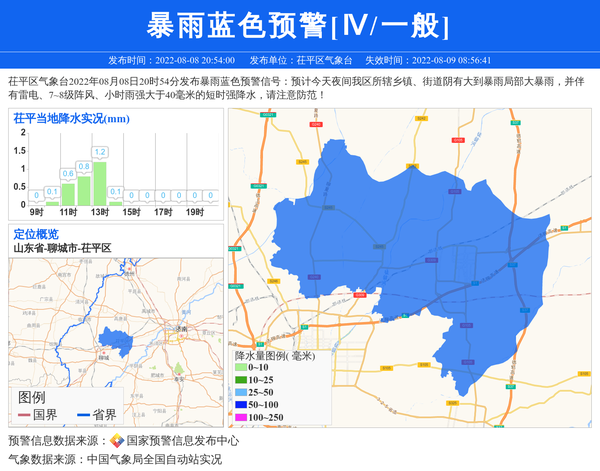 茌平区气象台2022年08月08日20时54分发布暴雨蓝色预警信号:预计今天夜间我区所辖乡镇、街道阴有大到暴雨局部大暴雨,并伴有雷电、7~8级阵风、小时雨强大于40毫米的短时强降水,请注意防范! 信息来源:国家预警信息发布中心; 发布单位:茌平区气象台。