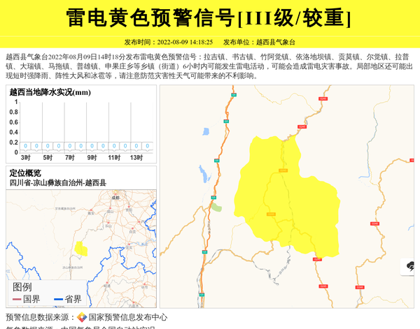 越西县气象台2022年08月09日14时18分发布雷电黄色预警信号:拉吉镇、书古镇、竹阿觉镇、依洛地坝镇、贡莫镇、尔觉镇、拉普镇、大瑞镇、马拖镇、普雄镇、申果庄乡等乡镇(街道)6小时内可能发生雷电活动,可能会造成雷电灾害事故。局部地区还可能出现短时强降雨、阵性大风和冰雹等,请注意防范灾害性天气可能带来的不利影响。 信息来源:国家预警信息发布中心; 发布单位:越西县气象台。